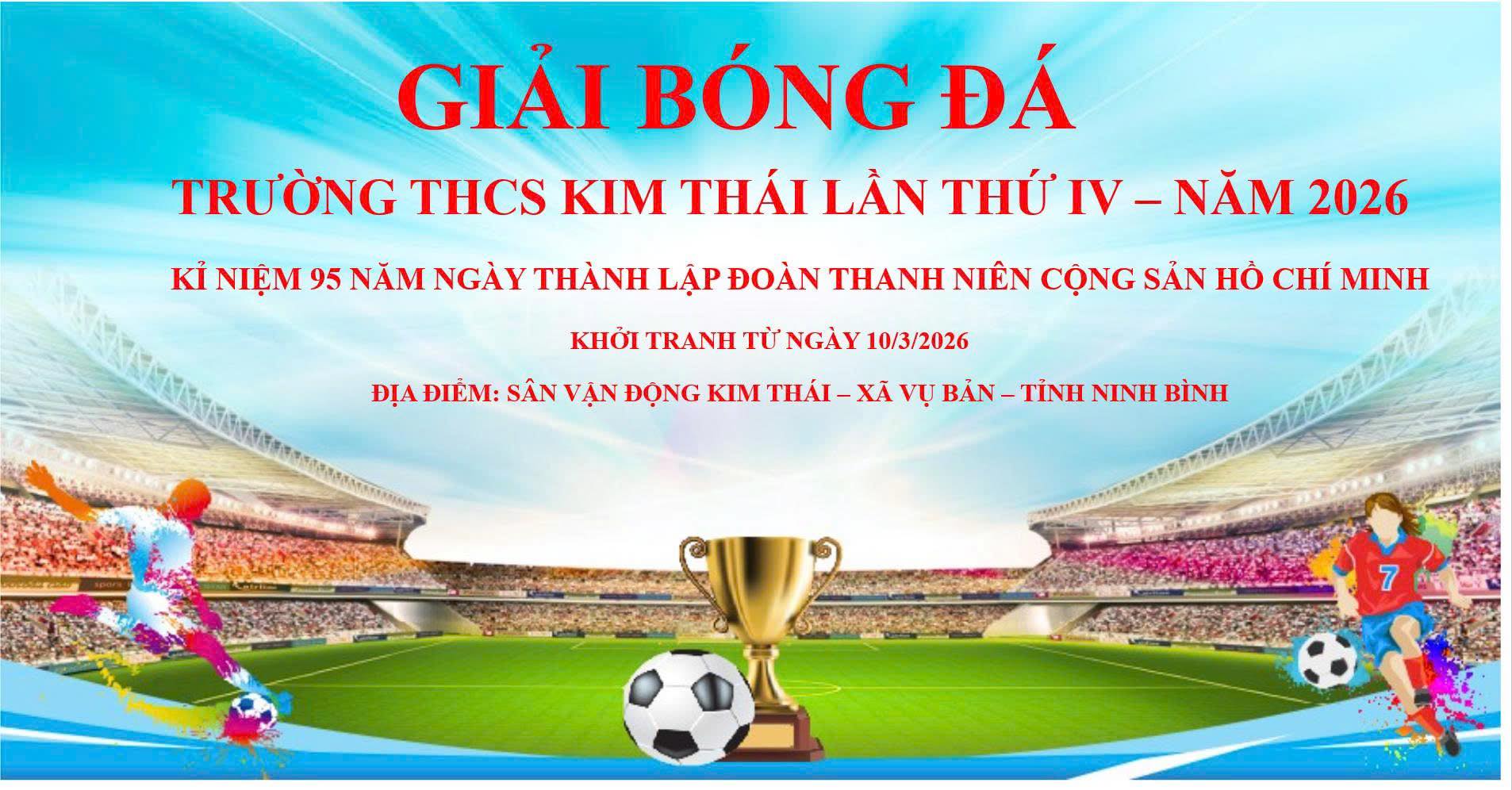 Nhân dịp kỷ niệm 95 năm Ngày thành lập Đoàn Thanh niên Cộng sản Hồ Chí Minh (26/3/1931 – 26/3/2026), Trường THCS Kim Thái tổ chức Giải bóng đá thường niên năm học 2025 – 2026 (lần thứ IV) nhằm tạo sân chơi lành mạnh, bổ ích cho học sinh; đồng thời góp phần rèn luyện thể chất, bồi dưỡng tinh thần đoàn kết, ý thức kỷ luật và lối sống tích cực trong học đường.