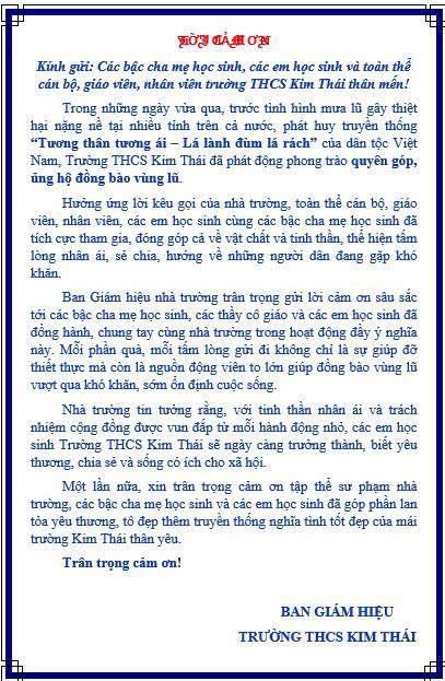 THẦY VÀ TRÒ TRƯỜNG THCS KIM THÁI CHUNG TAY – HƯỚNG VỀ ĐỒNG BÀO LŨ LỤT THÂN YÊU